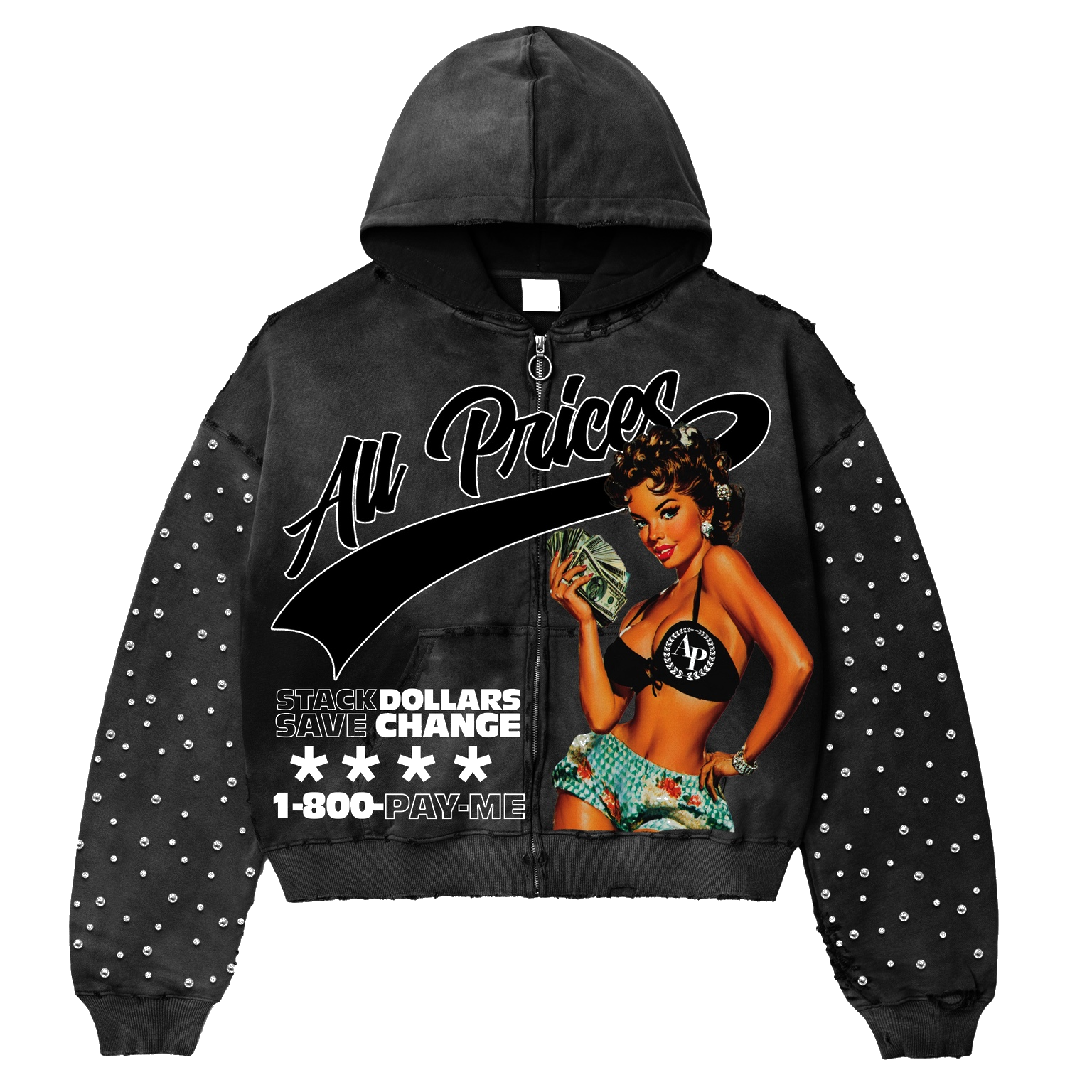 Bold graphics. Premium feel. Built for everyday hustle.. The Black Bills Hoodie features All Prices branding, money-inspired artwork, and splatter sleeves on a heavyweight zip-up